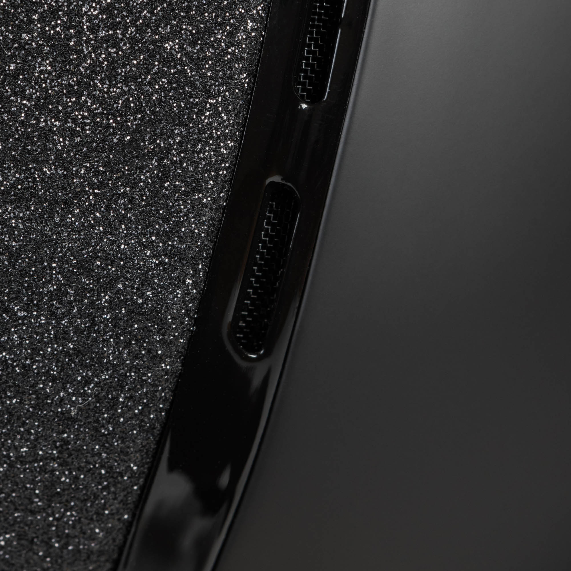 „Caracas“ zeichnet sich mit dem dezent glitzernden Mittelteil und den schwarz glänzenden Details durch seine raffinierte, unaufdringliche Eleganz aus. Ein dekoratives Hochglanzband umfasst die effizienten Belüftungslöcher und macht sie zu einem integralen Bestandteil des Designs.